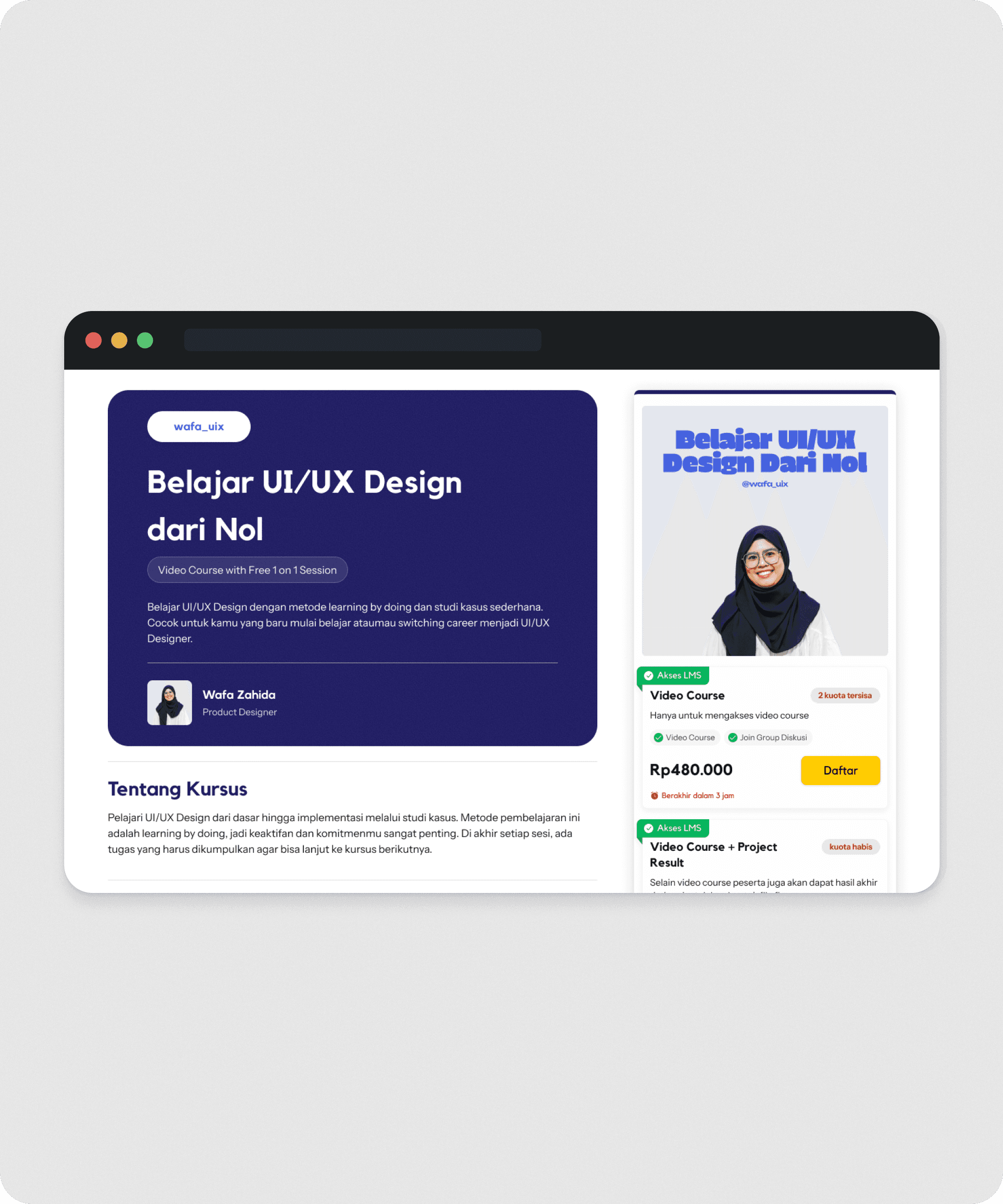 waktu awal cari Web Designer, aku cari lewat tiktok. Dan ketemu ka wafa. Di kontennya, Ka Wafa suka berbagi mengenai ui ux dan juga edukasi. Sekedar melihat kontennya aja, aku udah percaya dengan ka wafa. Semua sesuai apa yang ditampilkan di sosial media ka wafa dengan kepribadian ka wafa itu sendiri. Jadii ga zonk! Luv ka wafa😘 Dan selama proses membuat Web, ka Wafa sangat komunikatif. Aku yang ga paham apa apapun jadi sedikit mengerti. Penyampaian ka Wafa sangat mudah dipahami, dan yang paling penting adalah ka wafa sangat fast respon. Menurutku komunikasi sangat penting, dan ka Wafa menjalankan itu dengan sangat baik. Akupun terpukau dengan cara ka Wafa manage client, alhasil webnyapun sesuai. Bahkan, ketika aku mendapat kesulitan di luar waktu perjanjian kerja sama, ka Wafa masih merespon dengan sangat baik dan juga membantu.. aaa love ka Wafa🥰